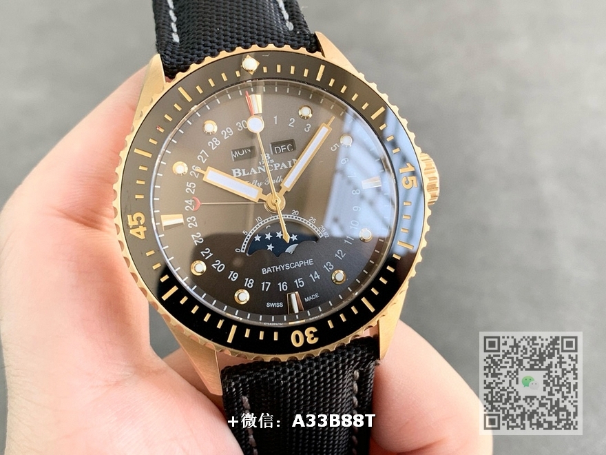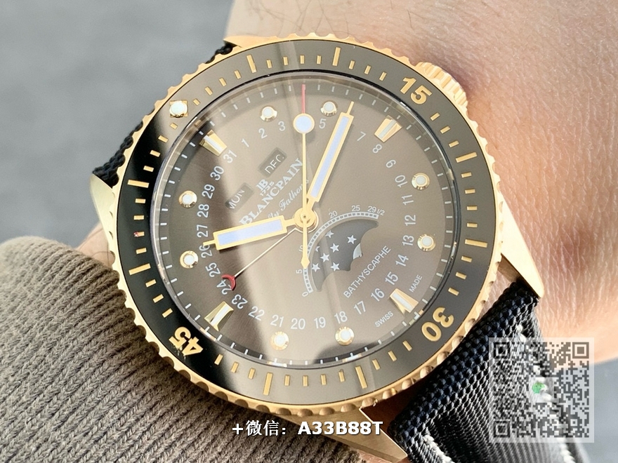 【品牌】宝珀【产品介绍】TW厂手表力作宝铂五十寻系列,5054-1110-B52A。压轴巨献,大三针夜光设计,直径43毫米,厚度13.3毫米!搭载6654.P自动机械机芯,具备星期显示,日期显示。月份显示,年份显示,月相显示,壳身轮廓分明,线条清晰决绝。优雅、律动之下隐藏着刚毅成熟的美。满足运动,商务,多功能性佩戴。定让君能依芯所向!TW诚意之作值得你拥有!【尺寸】43mmX13.3mm【表带】尼龙纤维表带,内侧牛皮【镜面】蓝宝石镜面【机芯】cal.6654机芯【防水】50米【配件】原装盒,说明书,质保卡,吊牌,香港机打发票【品质检测】保证所有手表实物拍摄,所见即所得 , 手表发货前都会有严格检查测试,确保您收到的手表无质量问题