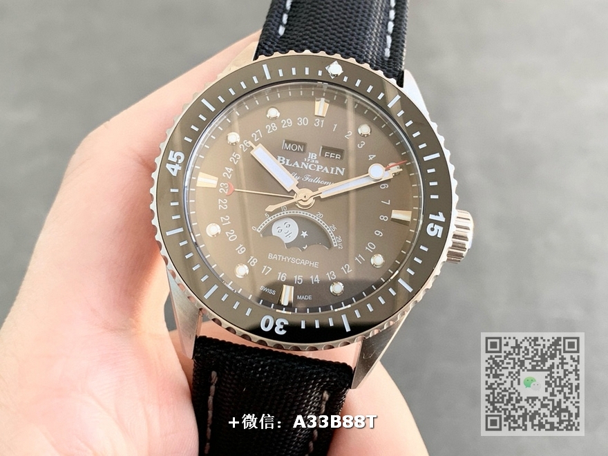 【品牌】宝珀【产品介绍】TW厂手表力作宝铂五十寻系列,5054-1110-B52A。压轴巨献,大三针夜光设计,直径43毫米,厚度13.3毫米!搭载6654.P自动机械机芯,具备星期显示,日期显示。月份显示,年份显示,月相显示,壳身轮廓分明,线条清晰决绝。优雅、律动之下隐藏着刚毅成熟的美。满足运动,商务,多功能性佩戴。定让君能依芯所向!TW诚意之作值得你拥有!【尺寸】43mmX13.3mm【表带】尼龙纤维表带,内侧牛皮【镜面】蓝宝石镜面【机芯】cal.6654机芯【防水】50米【配件】原装盒,说明书,质保卡,吊牌,香港机打发票【品质检测】保证所有手表实物拍摄,所见即所得 , 手表发货前都会有严格检查测试,确保您收到的手表无质量问题