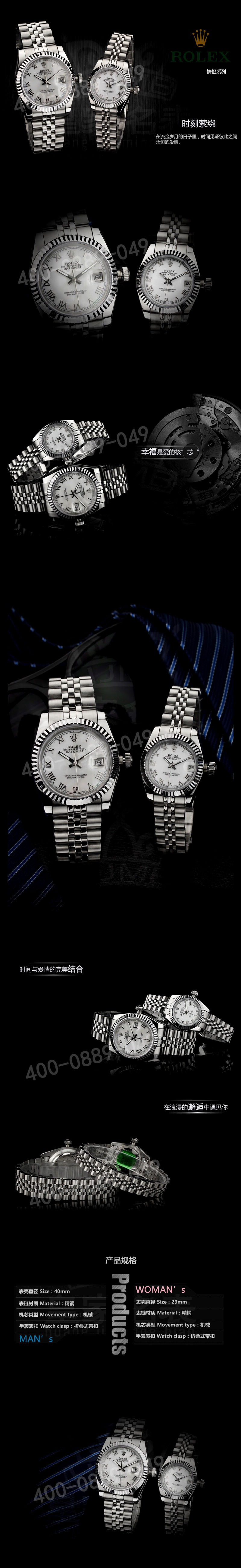 【Rolex劳力士】 日志系列 精钢三角坑纹外圈珍珠贝母表面罗马数字刻度日历视窗优雅机械情侣腕表
