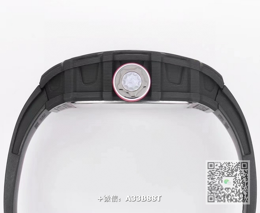 新作表圈和底盖采用粉色和白色石英碳纤维复合材料加工而成,中层表壳则以碳纤维和粉色石英碳纤维制成,每一个表壳都有独一无二的交错纹理。梯桶形表壳能够更舒适紧密的贴合手腕,表冠顶部巧妙模仿高尔夫球的凹凸造型,是颇为有趣的细节。