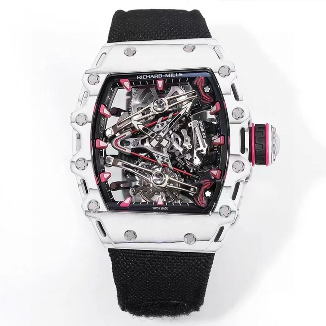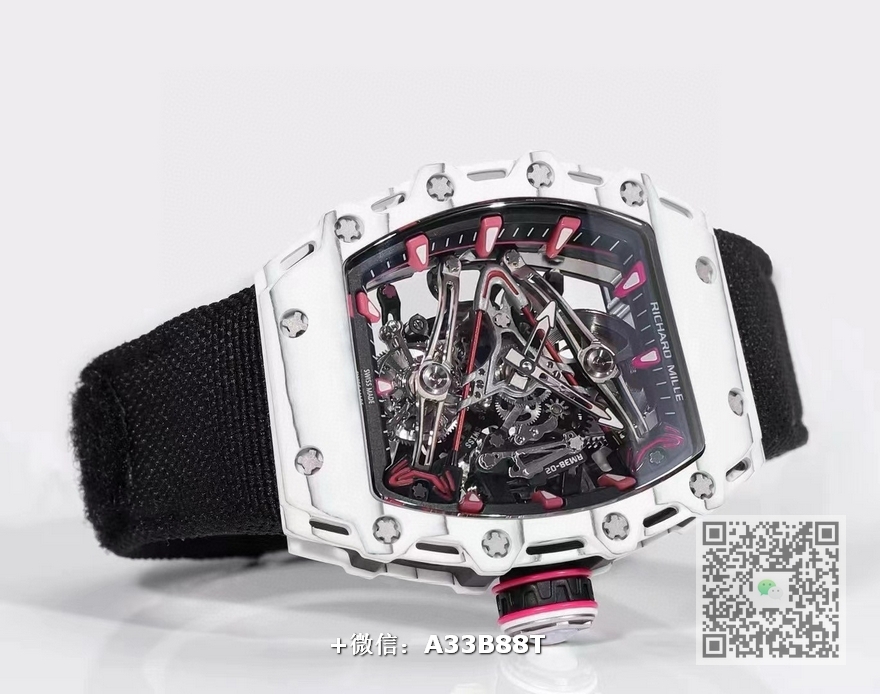 【品牌】理查德米勒【产品介绍】新表RICHARD MILLE 理查米尔 推出 RM 38-02 Tourbillon Bubba Watson 粉色主题镂空陀飞轮腕表:高尔夫球灵感风格醒目的新作——「RM 38-02 Tourbillon Bubba Watson」陀飞轮腕表与高尔夫职业球手 Bubba Watson 合作设计,独特的粉红色来自这位高尔夫名将钟爱的 PING 一号球杆,风格尤为明快,让人心生愉悦。新作表圈和底盖采用粉色和白色石英碳纤维复合材料加工而成,中层表壳则以碳纤维和粉色石英碳纤维制成,每一个表壳都有独一无二的交错纹理。梯桶形表壳能够更舒适紧密的贴合手腕,表冠顶部巧妙模仿高尔夫球的凹凸造型,是颇为有趣的细节。全开放式表盘让佩戴者清晰欣赏机芯的完整运转,镂空桥板在表盘中勾勒出横向的「V」字形,粉色手绘图案则来自 Bubba Watson 使用的球杆杆头。6点陀飞轮结构能够承受10000g冲击力,职业球手在高速击杆时也能稳定运转。搭载 RM 38-02 手动上链机芯,摆频28800vph,提供52小时动力储备。这枚机芯采用碳纤维制作镂空底板,具备优异的防震性能。桥板依然为坚固的 5级钛金属材质,背面的小孔亦融入粉色元素装饰。【款式】男款【尺寸】43.70 x 50.04mm【表带】橡胶表带/尼龙纤维表带,两种表带类型可供选择,二选一【镜面】蓝宝石镜面【机芯】RM38-02手动陀飞轮机芯【防水】50米防水【配件】原装盒,说明书,质保卡,吊牌,香港机打发票【品质检测】保证所有手表实物拍摄,所见即所得 , 手表发货前都会有严格检查测试,确保您收到的手表无质量问题