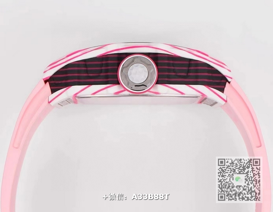 新作表圈和底盖采用粉色和白色石英碳纤维复合材料加工而成,中层表壳则以碳纤维和粉色石英碳纤维制成,每一个表壳都有独一无二的交错纹理。梯桶形表壳能够更舒适紧密的贴合手腕,表冠顶部巧妙模仿高尔夫球的凹凸造型,是颇为有趣的细节。