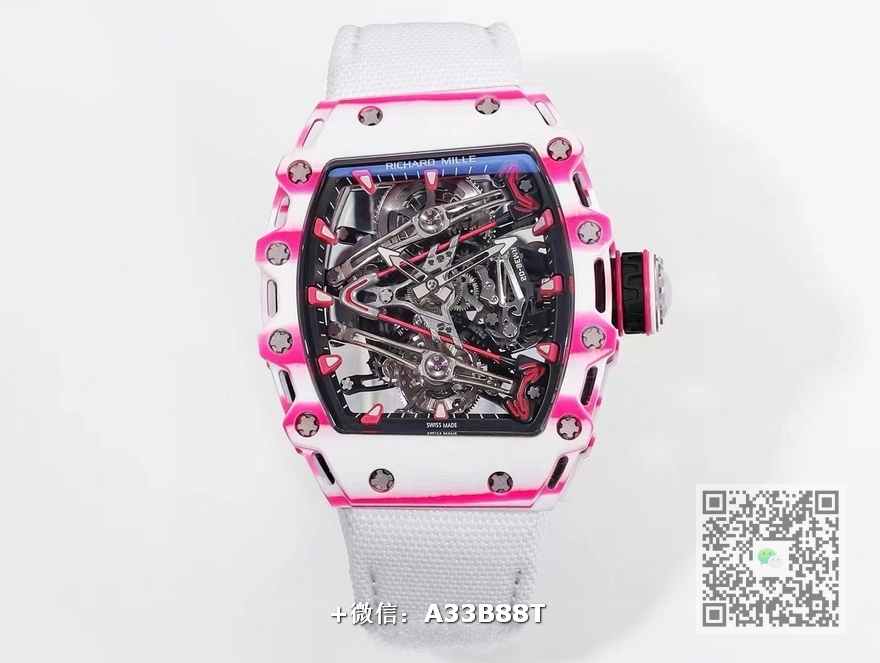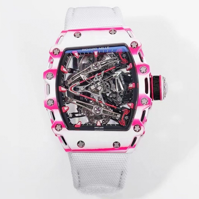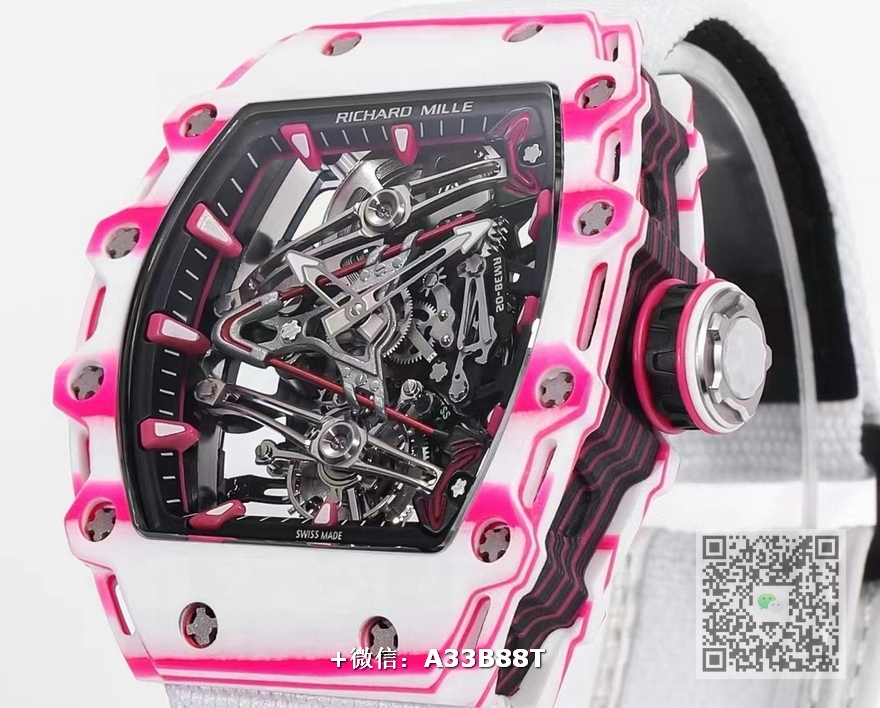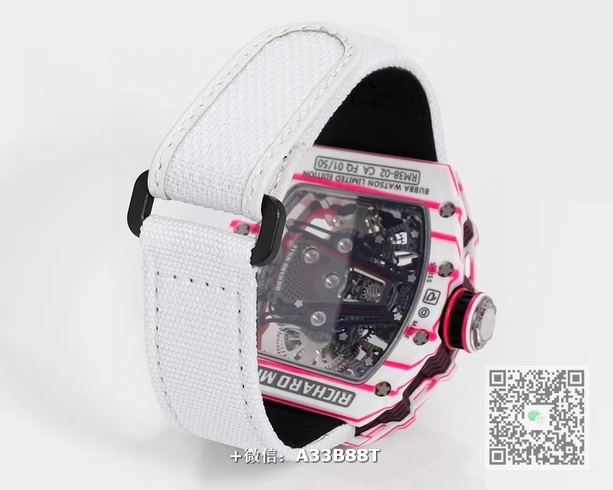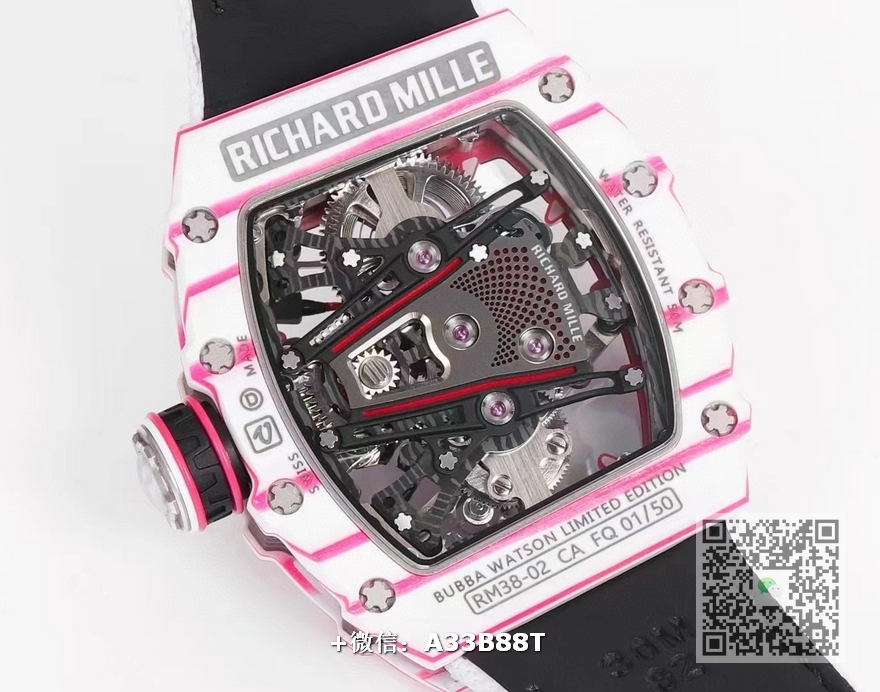【品牌】理查德米勒【产品介绍】新表RICHARD MILLE 理查米尔 推出 RM 38-02 Tourbillon Bubba Watson 粉色主题镂空陀飞轮腕表:高尔夫球灵感风格醒目的新作——「RM 38-02 Tourbillon Bubba Watson」陀飞轮腕表与高尔夫职业球手 Bubba Watson 合作设计,独特的粉红色来自这位高尔夫名将钟爱的 PING 一号球杆,风格尤为明快,让人心生愉悦。新作表圈和底盖采用粉色和白色石英碳纤维复合材料加工而成,中层表壳则以碳纤维和粉色石英碳纤维制成,每一个表壳都有独一无二的交错纹理。梯桶形表壳能够更舒适紧密的贴合手腕,表冠顶部巧妙模仿高尔夫球的凹凸造型,是颇为有趣的细节。全开放式表盘让佩戴者清晰欣赏机芯的完整运转,镂空桥板在表盘中勾勒出横向的「V」字形,粉色手绘图案则来自 Bubba Watson 使用的球杆杆头。6点陀飞轮结构能够承受10000g冲击力,职业球手在高速击杆时也能稳定运转。搭载 RM 38-02 手动上链机芯,摆频28800vph,提供52小时动力储备。这枚机芯采用碳纤维制作镂空底板,具备优异的防震性能。桥板依然为坚固的 5级钛金属材质,背面的小孔亦融入粉色元素装饰。【款式】男款【尺寸】43.70 x 50.04mm【表带】橡胶表带/尼龙纤维表带,两种表带类型可供选择,二选一【镜面】蓝宝石镜面【机芯】RM38-02手动陀飞轮机芯【防水】50米防水【配件】原装盒,说明书,质保卡,吊牌,香港机打发票【品质检测】保证所有手表实物拍摄,所见即所得 , 手表发货前都会有严格检查测试,确保您收到的手表无质量问题