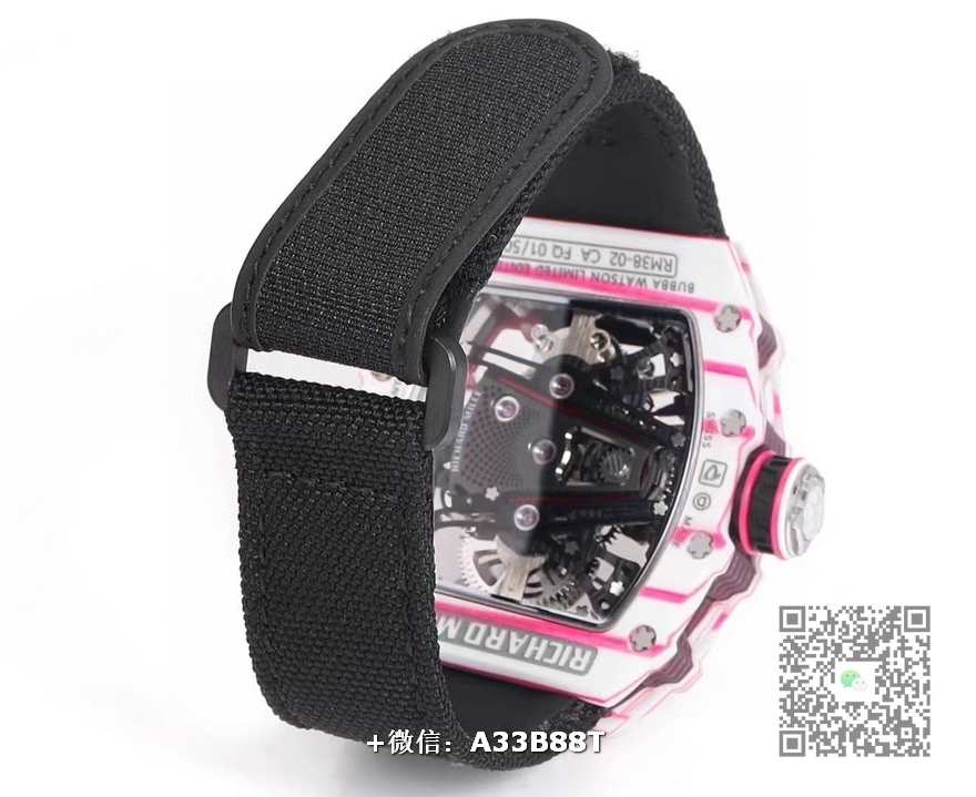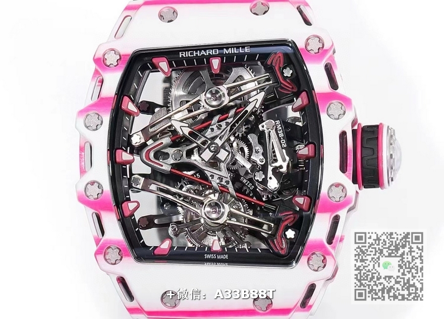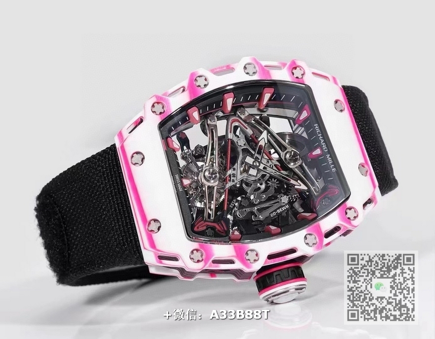 【品牌】理查德米勒【产品介绍】新表RICHARD MILLE 理查米尔 推出 RM 38-02 Tourbillon Bubba Watson 粉色主题镂空陀飞轮腕表:高尔夫球灵感风格醒目的新作——「RM 38-02 Tourbillon Bubba Watson」陀飞轮腕表与高尔夫职业球手 Bubba Watson 合作设计,独特的粉红色来自这位高尔夫名将钟爱的 PING 一号球杆,风格尤为明快,让人心生愉悦。新作表圈和底盖采用粉色和白色石英碳纤维复合材料加工而成,中层表壳则以碳纤维和粉色石英碳纤维制成,每一个表壳都有独一无二的交错纹理。梯桶形表壳能够更舒适紧密的贴合手腕,表冠顶部巧妙模仿高尔夫球的凹凸造型,是颇为有趣的细节。全开放式表盘让佩戴者清晰欣赏机芯的完整运转,镂空桥板在表盘中勾勒出横向的「V」字形,粉色手绘图案则来自 Bubba Watson 使用的球杆杆头。6点陀飞轮结构能够承受10000g冲击力,职业球手在高速击杆时也能稳定运转。搭载 RM 38-02 手动上链机芯,摆频28800vph,提供52小时动力储备。这枚机芯采用碳纤维制作镂空底板,具备优异的防震性能。桥板依然为坚固的 5级钛金属材质,背面的小孔亦融入粉色元素装饰。【款式】男款【尺寸】43.70 x 50.04mm【表带】橡胶表带/尼龙纤维表带,两种表带类型可供选择,二选一【镜面】蓝宝石镜面【机芯】RM38-02手动陀飞轮机芯【防水】50米防水【配件】原装盒,说明书,质保卡,吊牌,香港机打发票【品质检测】保证所有手表实物拍摄,所见即所得 , 手表发货前都会有严格检查测试,确保您收到的手表无质量问题